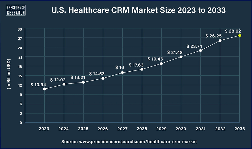 According to www.globenewswire.com, The global healthcare CRM market size is calculated at USD 17.1 billion in 2024 and is expected to reach around USD 40.02 billion by 2033, growing at a solid CAGR of 9.91% from 2024 to 2033.